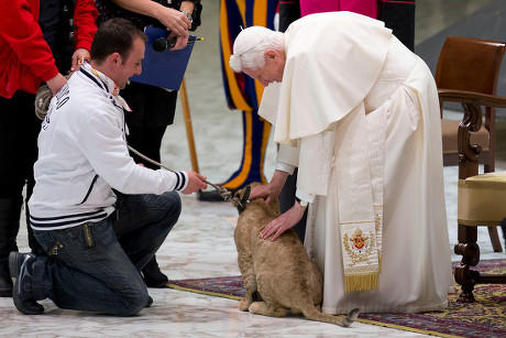 Pope Benedict XVI strokes a lion cub as he greets circus artists and workers, during an audience he held in the Pope Paul VI hall, at the Vatican, . Benedict clapped and watched amused as circus workers flipped, flopped, juggled and twisted before him in what the Vatican has called a historic audience to make street performers and other itinerant entertainers feel like they belong to the church