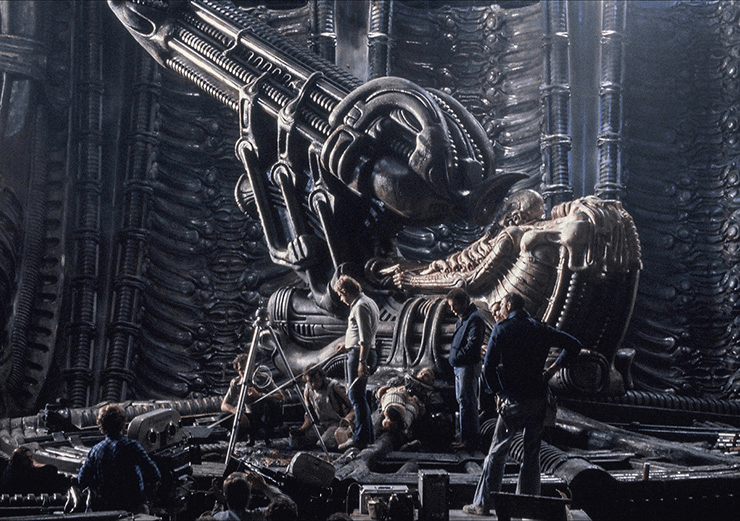 A set photo showing the first film’s crew on the iconic space jockey set.