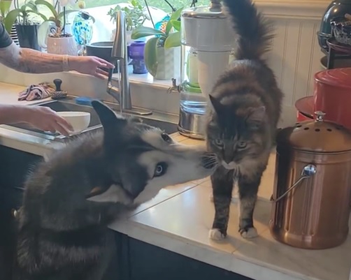 Feefee gets a warm welcome from one of the family’s dogs. The 13-year-old tabby cat was stolen from her family’s driveway on July 21 by an Amazon delivery driver. Credit: Ray Ishak
