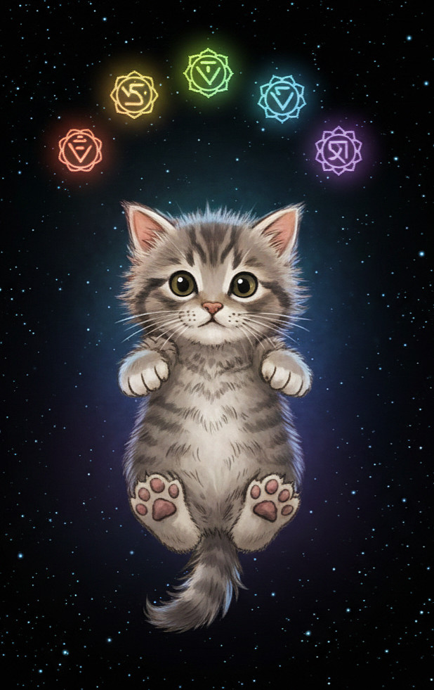 Buddy the Cat sits in a lotus position, whiskers relaxed, with a serene expression on his face.