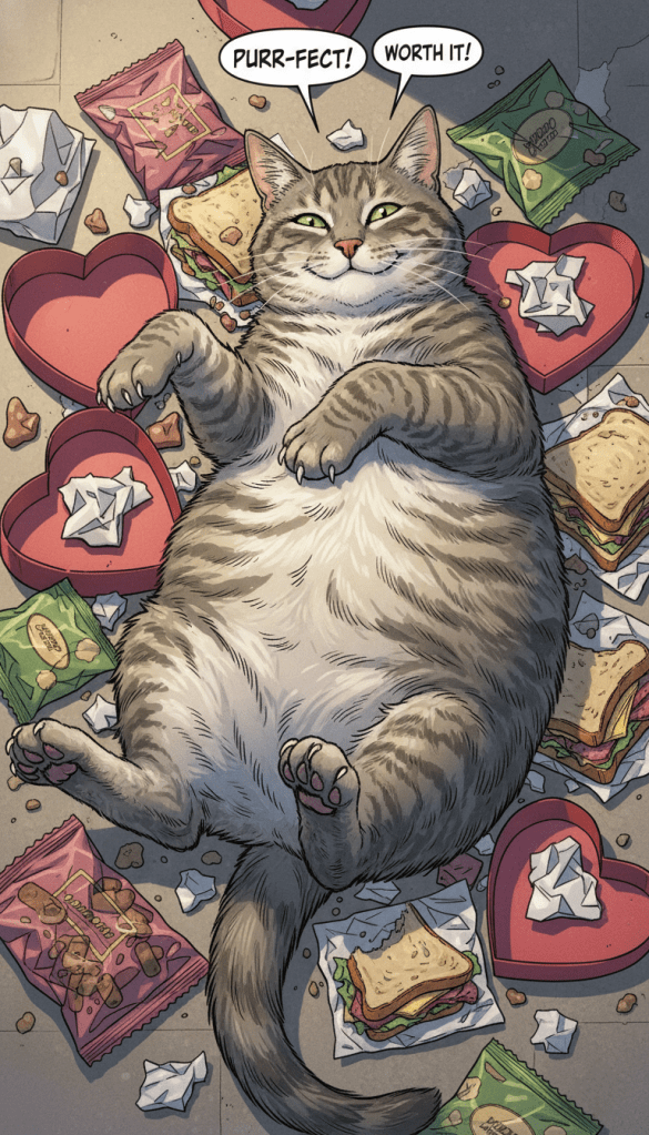 The chubby tabby has been the recipient of countless Valentine’s Day gifts this year, reflecting his considerable popularity among females, both feline and human. He’s been eating his way through them with enthusiasm since the packages began arriving.