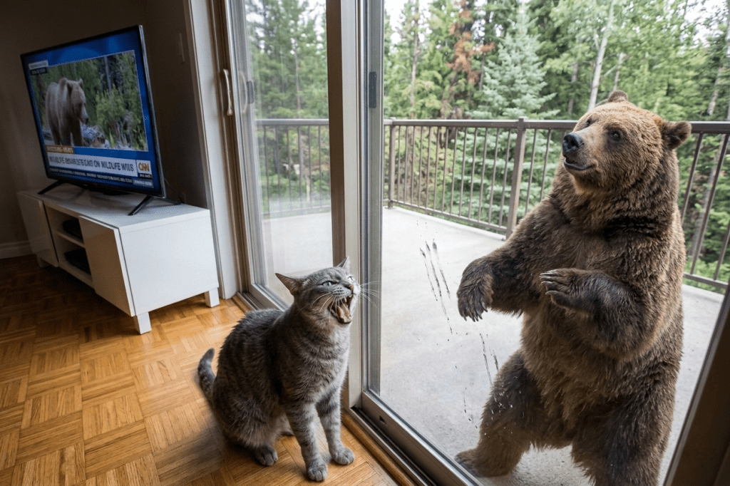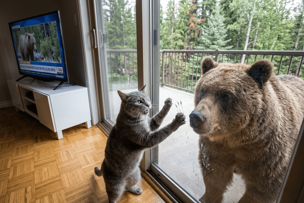 The bear watched warily, then flinched instinctively as the intimidating feline launched a sequence of aggressive and powerful paw strikes. The ursine beast recoiled from the thunderous impacts of paws against glass, reconsidering its position in the face of such a formidable display of force.
