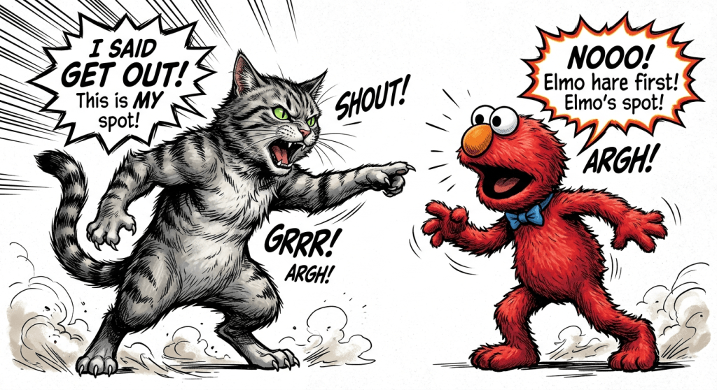 So there you have it. Weird things can happen when you have a huge cat in your home…or one who sounds like Elmo.